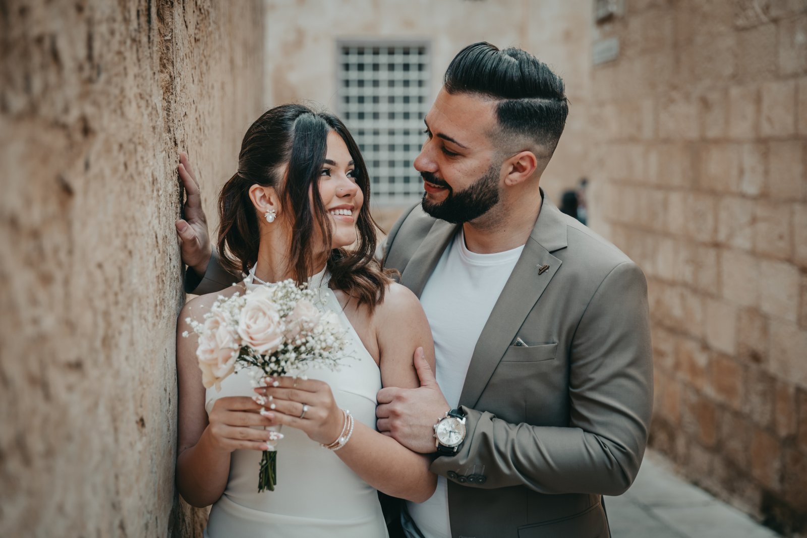 The narrow golden-hued streets, soft Mediterranean light, and gentle evening breeze set the tone for a truly romantic session — intimate, elegant, and full of laughter.