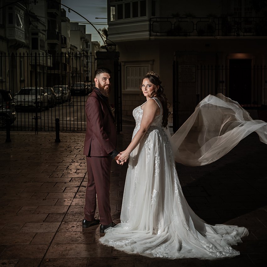 After the ceremony, we stopped at The Stazzjon in Birkirkara for the couple session. The rustic charm, warm tones, and vintage architecture made for timeless photographs — a blend of urban texture and romantic stillness.